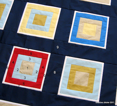 1. Start with center square 2. Sew a strip to each side, iron towards outside of block and trim 3. Sew strip to top and bottom, iron and trim 4-7 Repeat.